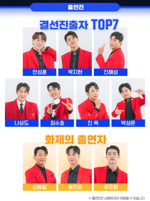 티켓의 가격의 경우 지역마다 좌석과 가격이 차이가 납니다. 서울콘서트 기준으로 티켓 가격은 SR석 154,000원, R석 132,000원, S석 110,000원, A석 99,000원입니다. 출연진의 경우에는 결선 진출자 TOP7(안성훈, 박지현, 진해성, 나상도, 최수호, 진욱, 박성온)과 화제의 출연자였던 김용필, 송민준, 윤준협이 출연합니다.