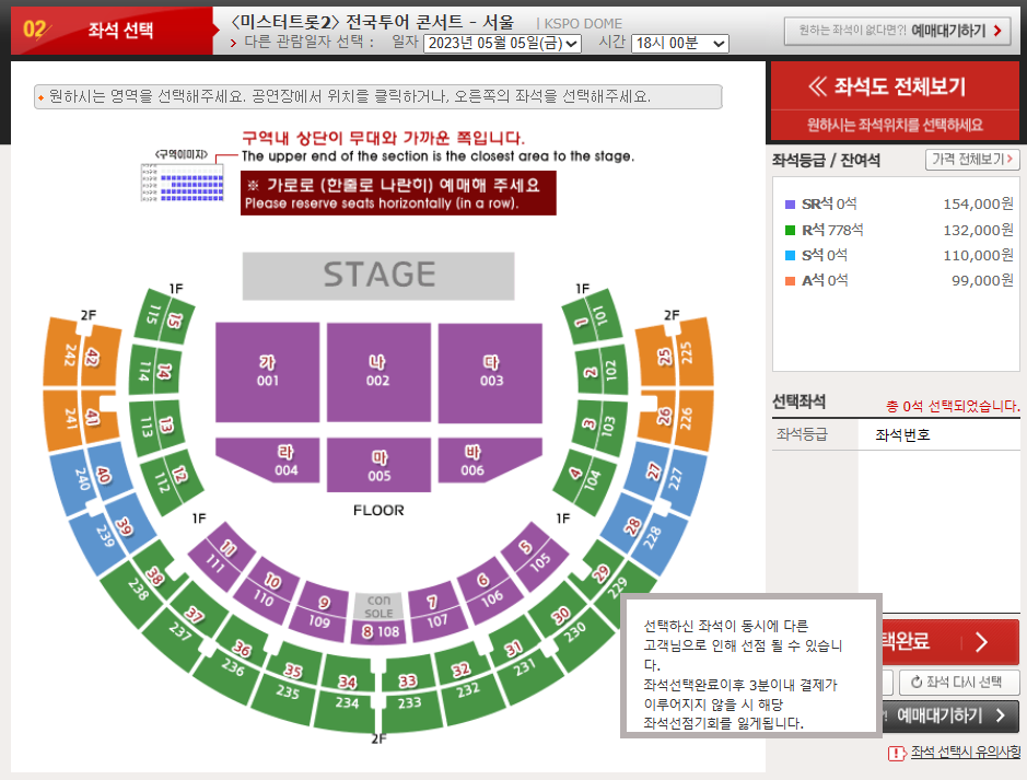 0석으로 되어 있어도 취소하는 사람이 생길 수도 있다. 아직 좋은 좌석을 고르지 못했다면 예매대기하기 서비스를 이용하여도 된다. 고르